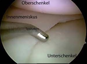 Hierbei wird eine Optik (Arthroskop) in das Gelenk eingeführt und der Gelenkinnenraum mit Hilfe einer Kamera inspiziert. Über einen zweiten Schnitt kann der Operateur unterschiedeliche Mikroinstrumente einsetzen, um die Verletzung bzw. den Schaden im Gelenkinnern unter Sicht zu beheben.